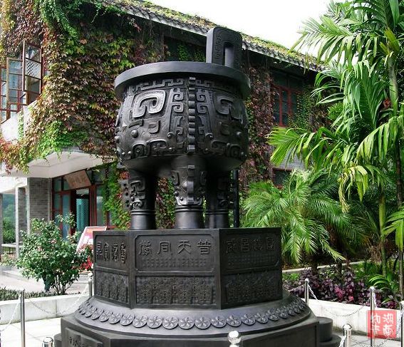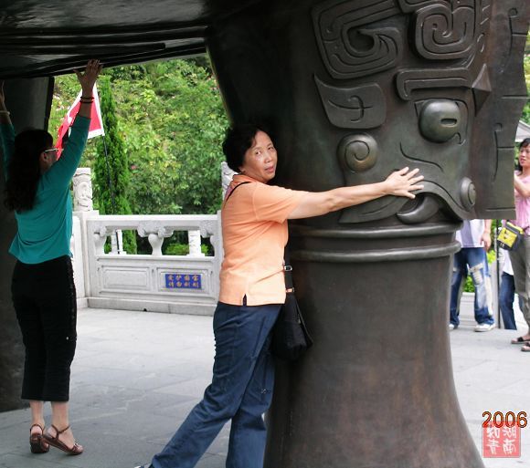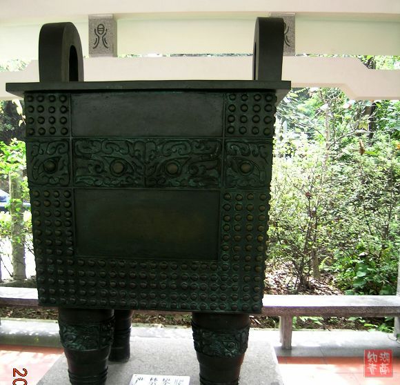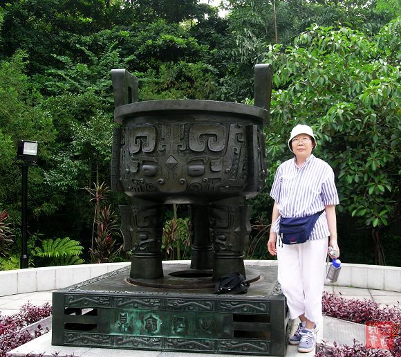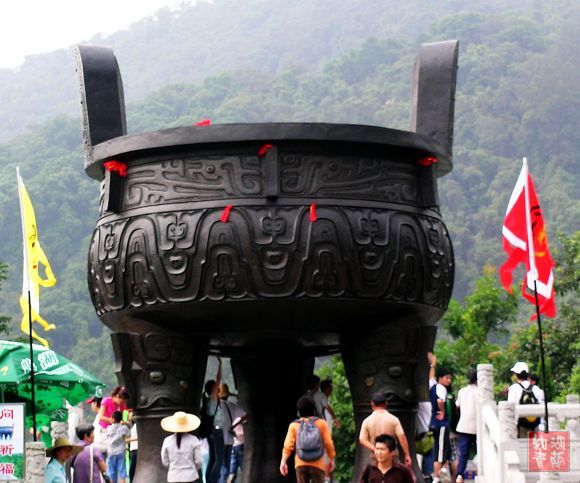 我们坐车直达鼎湖之巅--宝鼎园,这里是是游览景区的的最高峰。而这宝鼎园是新建的人文景观,它以鼎为主题,园内有古今著名鼎制成复制品供人们鉴赏。我觉得实则无可看之处。但宝鼎园内据说有两个世界之最,一是肇庆九龙宝鼎,它重16吨、高6.68米、宽5.58米,巨大无比,巍然伫立在宝鼎园中央。二是重达2吨的端溪龙皇砚,被置于园门口。肇庆出产的端砚位居我国四大名砚之首,为历代儒士和官宦喜爱,至今仍享有盛名。