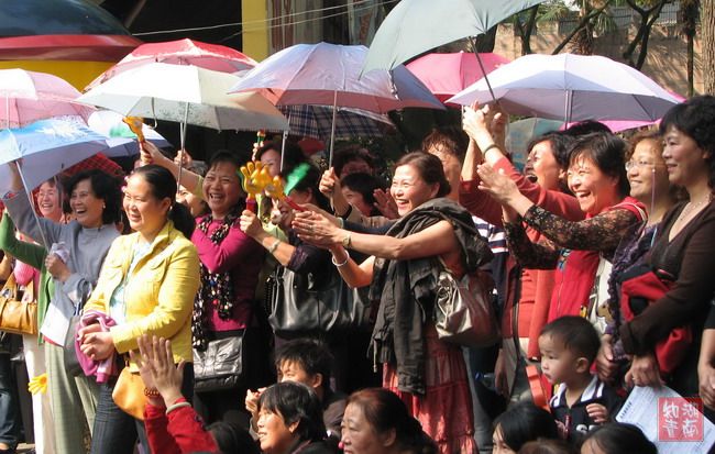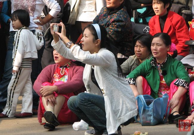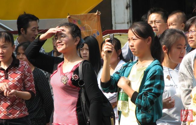 演出在歌颂十七大的歌声中达到高潮,“摄记”们不顾一切站上舞台抢拍。我只好退到场地后面,请一位站在花坛上的女士让出位置,拍了这一张。