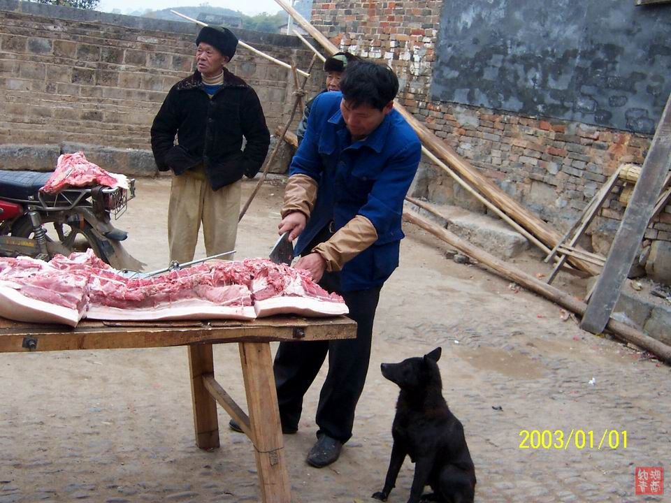 案板上砍肉的场景还和当年一样,孩子们是穿得更好一些,照片的生活情趣很浓,只是照片上的日子不对,还没有调好,
