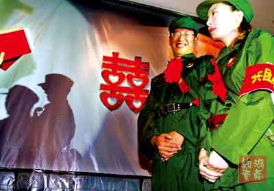 昨日,江北金源大饭店。北京的尹先生和重庆的黄毅小姐穿着草绿色军装、挎着草绿色书包、脚穿草绿色军鞋举行结婚。据称,两人此举是为了让当过知青的母亲重温知青生活。