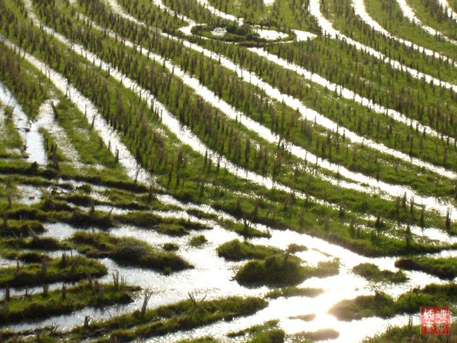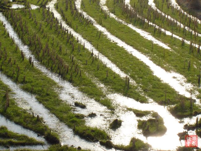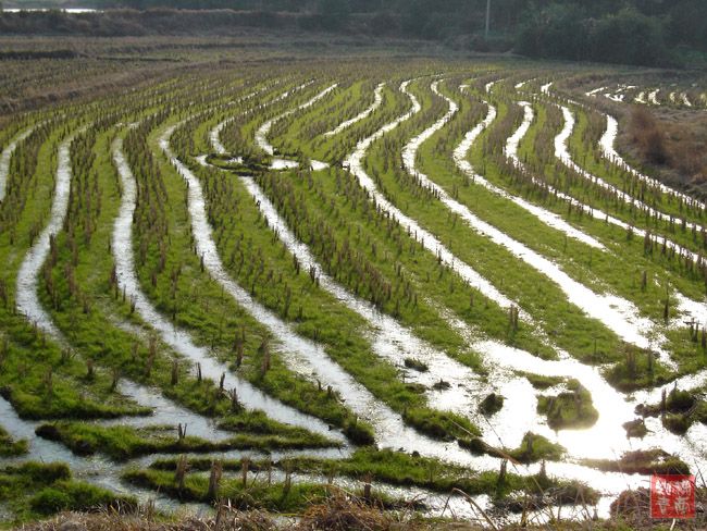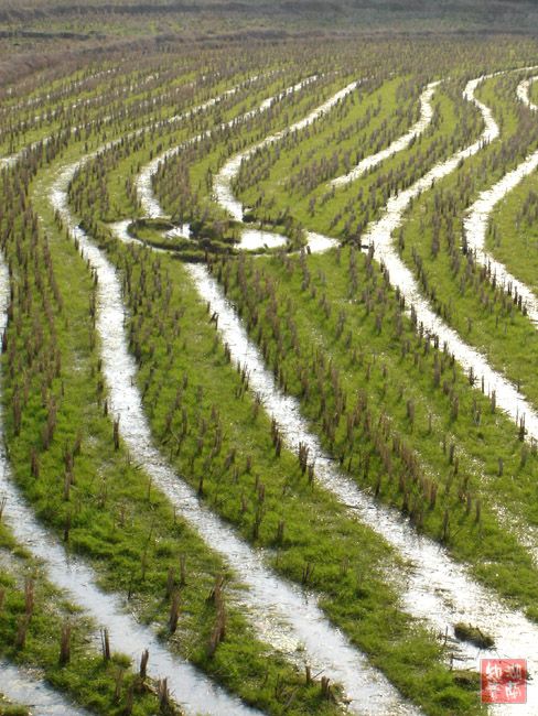 那几幅禾蔸田怎么回事?为什么有那些犁出来的水沟沟?不太明白。有一种图案美。