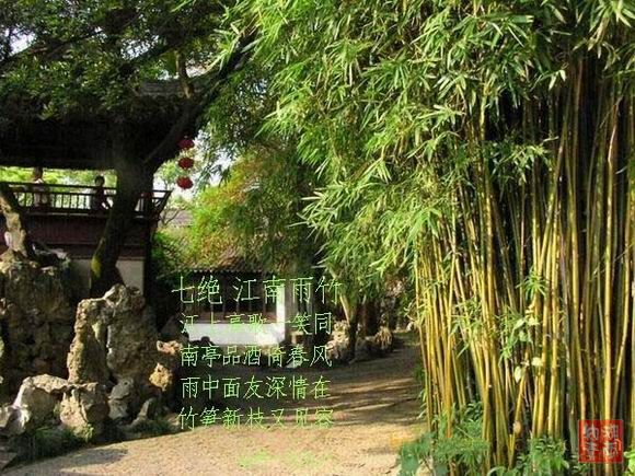 江南雨空山鸟语/作者--------------------------------------------------------------------------------------------淡淡的心韵滟滟江南水乡的纹理我是一曲三月艳丽的阳春弥漫空荡中的烟波是我的眷恋凝成滴滴撒落一天的春雨 空山鸟语2007.2.4下午写于荷花园┌┼♧竹林听