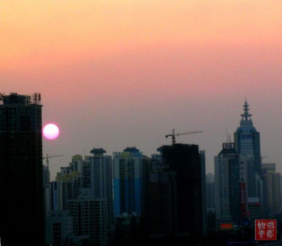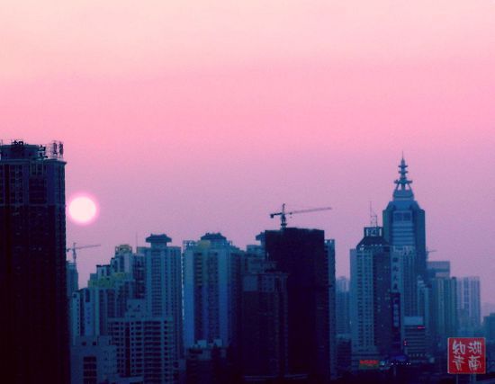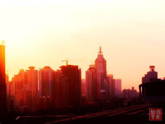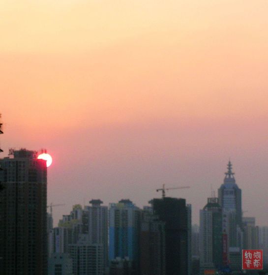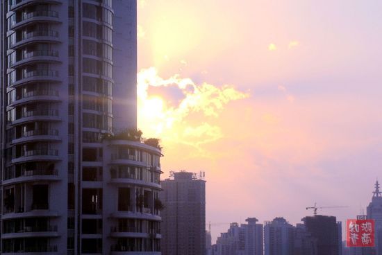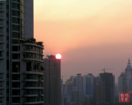 远处的楼房在夕阳的余辉下呈现出另一幅景像,夕阳最后的一撇使它喷薄如火。