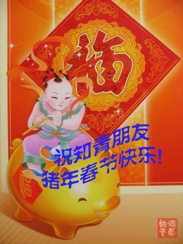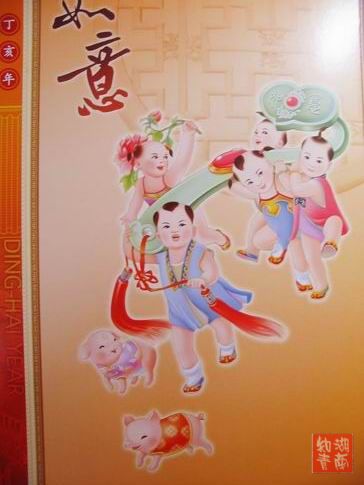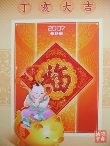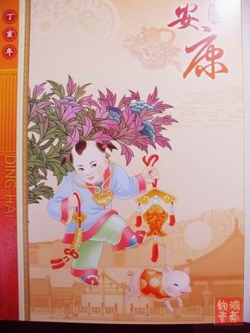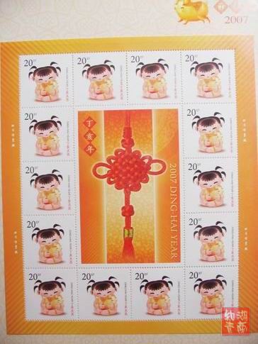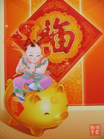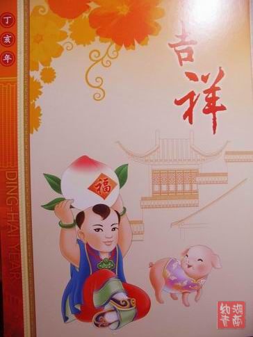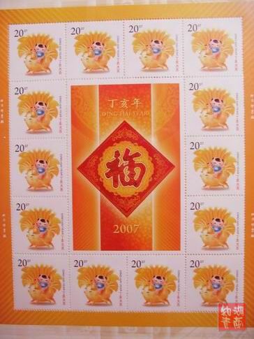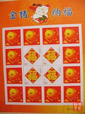 中国农历的丁亥年,老百姓俗称之为猪年。猪形态可爱,敦厚老实,被中国人视为丰收和喜庆的象征。中国人民邮政发行了《丁亥年》生肖邮票一枚,主图是一只头戴蓝印花布头巾、身披印有蝙蝠、如意、古钱币等图案披肩的“猪妈妈”正在为3只“猪宝宝”喂奶,另外两只已经吃饱的“猪宝宝”,一只趴在妈妈的背上,另一只调皮地拉妈妈尾巴嬉戏,整个画面充满了温情与和谐。图案中的“猪妈妈”和5只小猪,既可寓意为六“猪”兴旺,也可表达“五福临门”和“五子登科”的吉祥喜庆之意。邮票以模拟木偶漆器玩具的立体感,表现出猪的憨态可掬,从大红色基调的热烈、红火气氛中,体现了中国特色的大俗大雅、生机勃勃的景象。