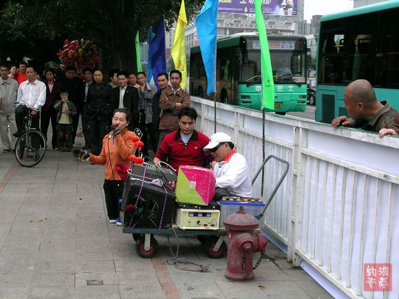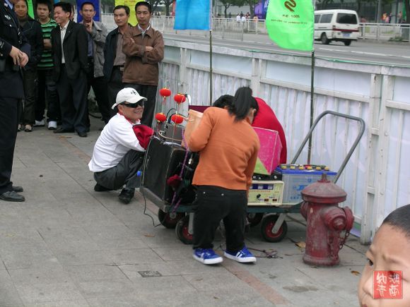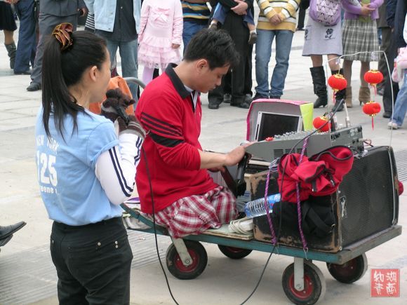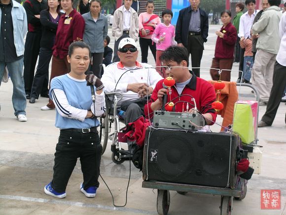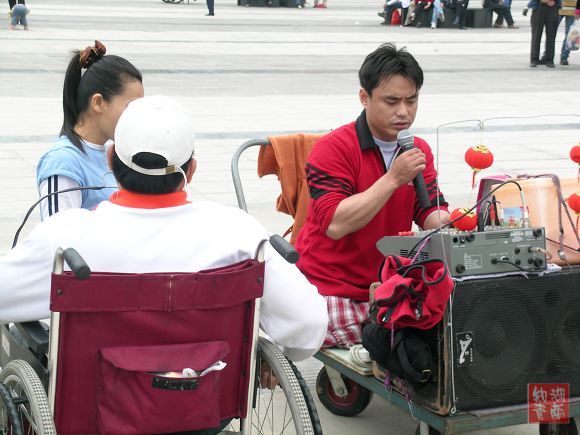 今天在深圳邓小平画像前的广场上有三个下肢残疾的人在演唱,募钱,引得许多人围观。
