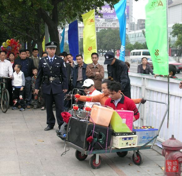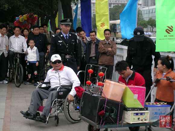 这时过来了两位警察向三位残疾人说明不能在这地方搞这种活动,请他们收拾好东西离开。残疾人坚持要唱完歌再走。警察让他们把歌唱完后,才过来帮助他们收拾东西,并推着轮椅把他们送走了。