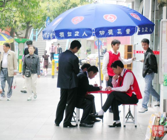 今天上街看到献血站有几个年轻人在登记献血。真没想到,大过年的,他们却趁着休息来向社会献出自己的爱心,真不简单。为了不打扰他们,我退到很远的地方拍了这两张照片,虽然拍得不好,我仍然以此表示对这些年轻人的敬意。
