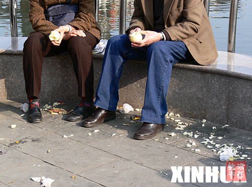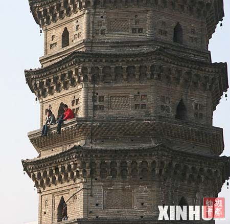 春节期间,人们纷纷走出家门,享受休闲乐趣。一些人的不文明行为却与春节的喜庆和谐气氛不相符。 新华社发 两位游人在安徽蒙城万佛塔上休息