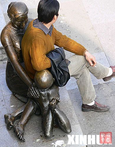 在贵阳市旅游景点甲秀广场,一男子坐在城市雕塑上“小憩”