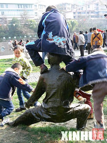 在贵阳市旅游景点甲秀广场,几个小孩在城市雕塑上玩耍在贵阳市旅游景点甲秀广场,游人随手将果皮抛在脚下