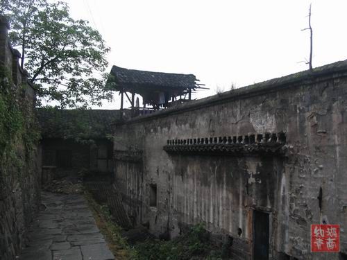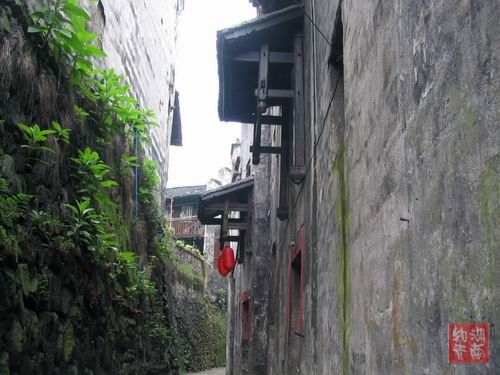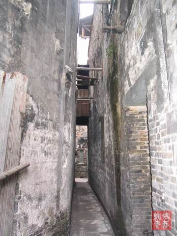 小巷.两边的墙向中间倾斜,须用木柱支住,中间仅容一人行走.正对着小巷的墙上镶着一块石头,上写着"泰山石敢当",其作用和<会同高椅之游>中的路碑相同.因不能发太多照片,故没发出来.