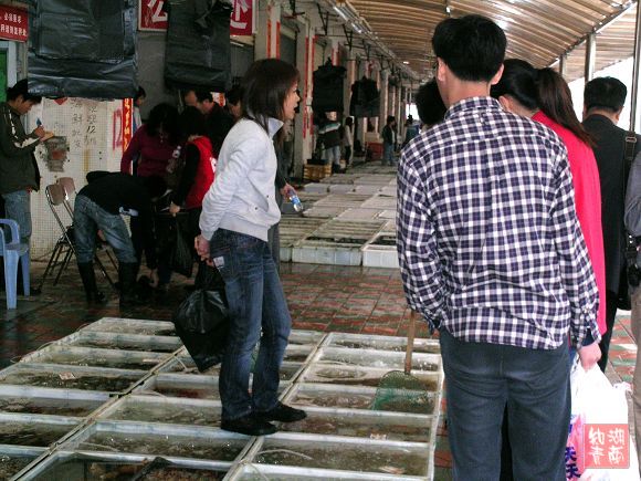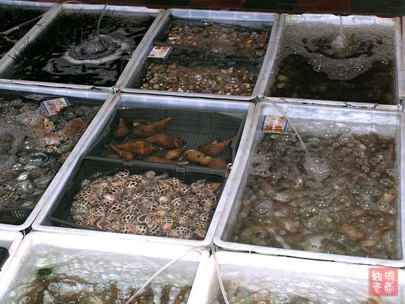 首先是在一个地方(地名忘记了)吃海鲜。这里几米宽的一条长街上,一边全部是卖活海鲜的排档,一字排开,起码有几十家;另一边则全部是加工海鲜的饭店,也是几十家沿街一字排开,相当壮观。顾客在排档选购了海鲜就可提到街对面的饭店加工,现买现做。