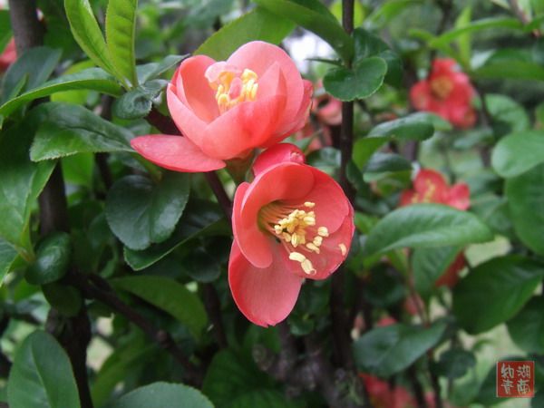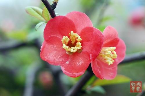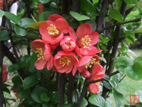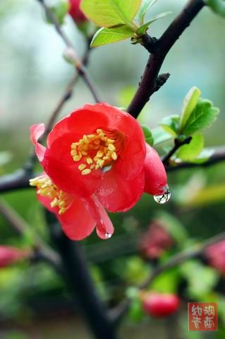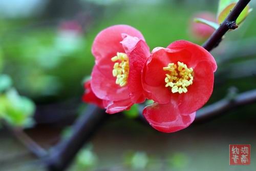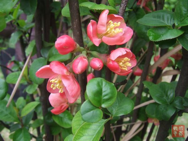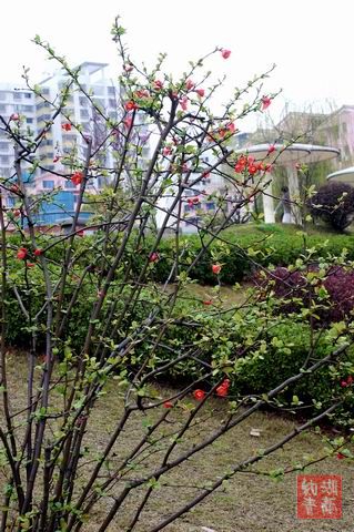 据友人相告,此花学名为"贴梗海棠",非"铁梗"也.我以为,名"贴梗",仅状其貌而已.此花不畏严寒,迎风斗雪,从冬至春,红花不败,名"铁梗"更能状其神,故仍其旧而不改其名也.