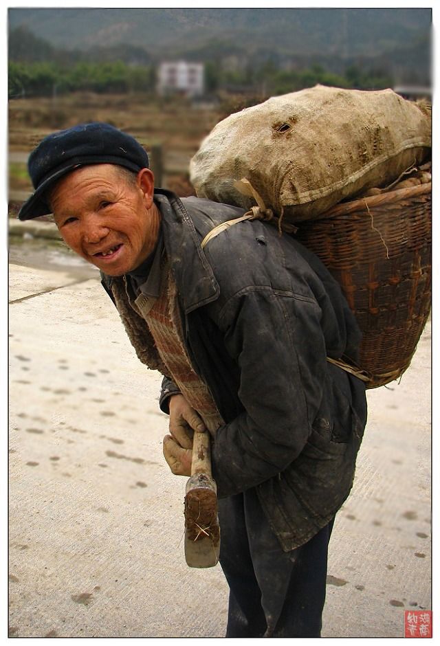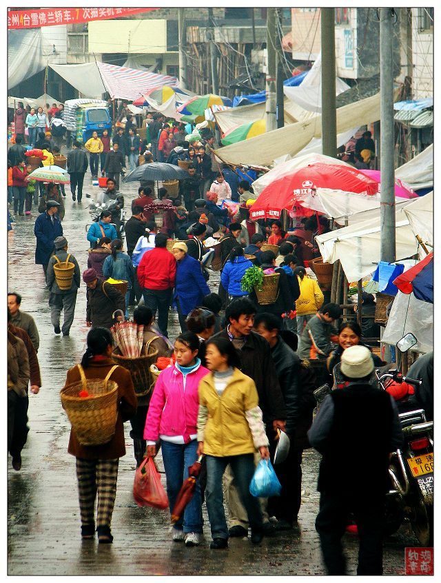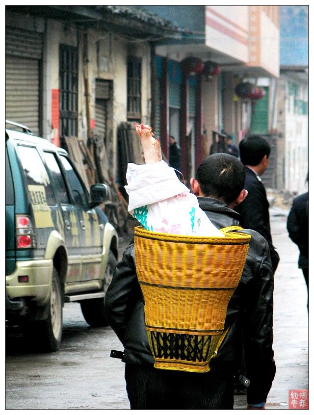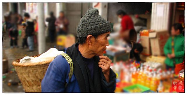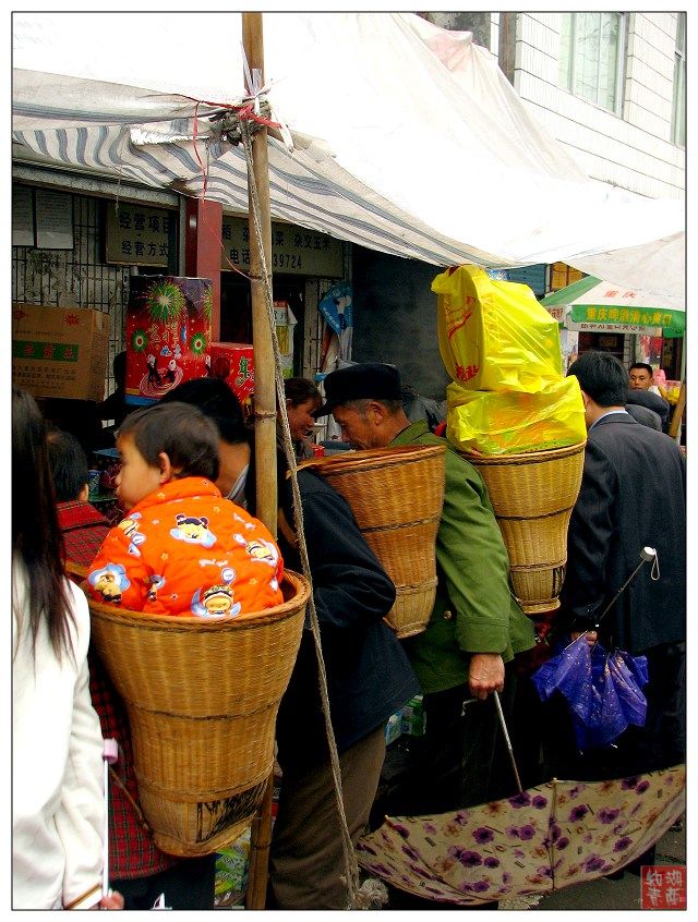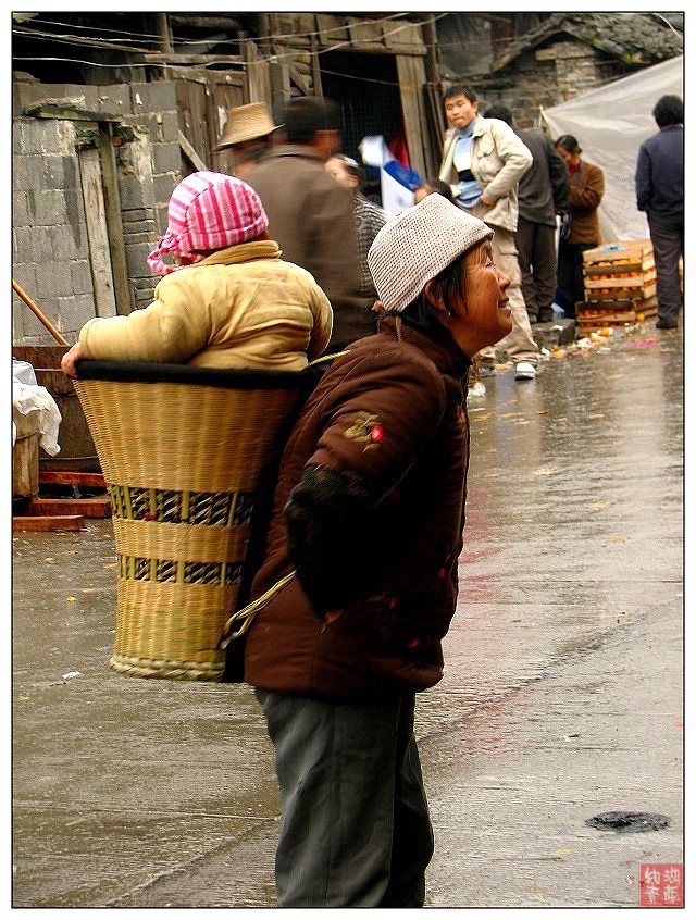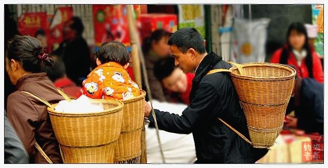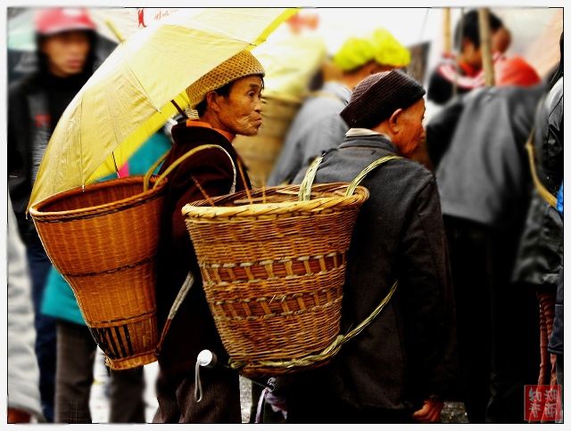 老两口赶集可以感受一种温馨的场景,甚至能感觉出表情中老头的敦厚与老太的精细……你看那各人背的背篓都粗细精致不一!老太的背篓放细活,老头的放……哈哈。