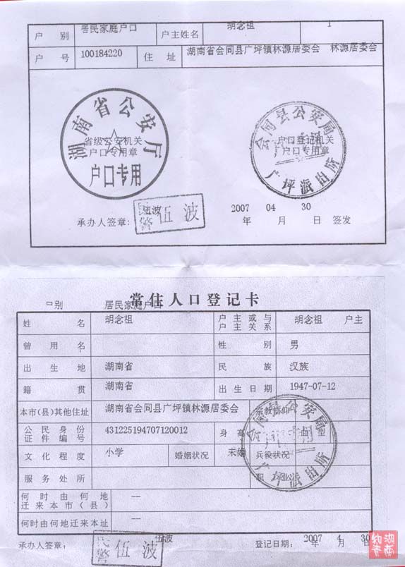 万分感谢湖南知青三人,我28年的的黑人生活终于结束,多亏湖南知青三人的帮助。在他们的帮助下,使我恢复了我的户口和身份。 特此感谢 广坪老知青胡念祖 2007/05/02