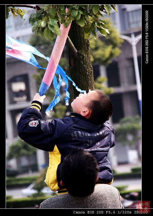 一老爷爷的风筝被挂到树枝上,游玩的的父子俩发现后赶忙过来帮忙.