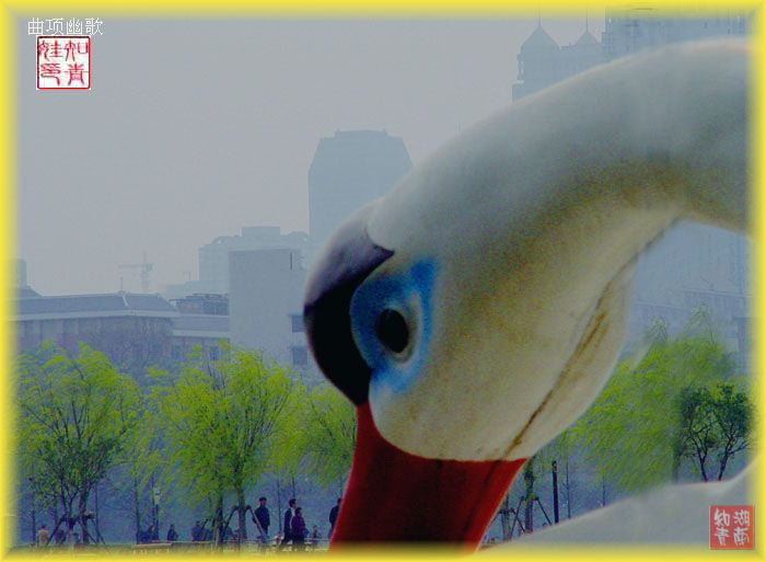 到了烈士公园,匆匆地去寻大千,眼睛余光却见年嘉湖面一游船经过,船是鹅形,曲项天歌。赶紧抢前几步,选择了一片高楼作背景,不料等得打开相机,对的焦来,游船却已驶过我选好的背景。因怕大千等我,不敢花时间重来,只好将就如此了。