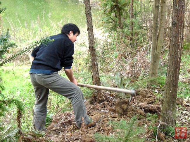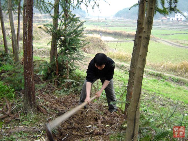 左侧藤蔓缠竹篱,右侧杉树高耸立。