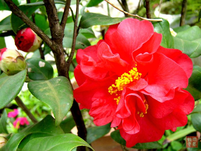 海棠茶花花怒放,新种红桃露新颜。