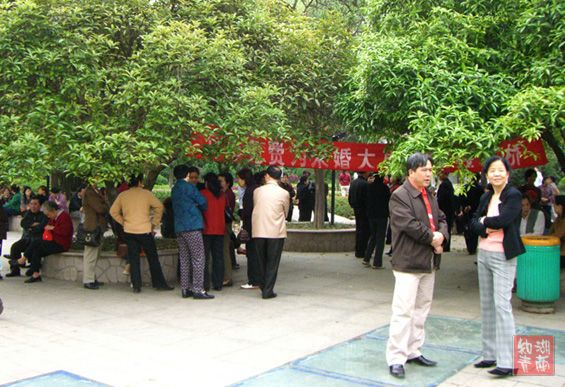 星期天去烈士公园拍樱花。从东门走到靠近烈士公园西门的湖边广场时,看到那里很热闹,心想是什么单位搞活动?但又都是些年近60的老人,他们有的坐着,有的站着,三三俩俩,表情严肃……我心生好奇,于是驻足观看,发现有一条横幅牵挂在两棵大树上。我是老花眼,远视力特别好,虽然是在横幅的背面,也看清楚了上面的字“父母免费为大龄未婚男女青年牵线搭桥”,原来这里来的都是大龄男女青年的父母。我觉得这是我国改革开放的新景象,就将它拍下来了。说不定哪位朋友家中正好有这方面的困难?也许我的这张照片能帮他找到一条解决困难的途径?如果他在那儿能解决问题那我就最高兴了。不过,要记得请我吃糖哦!哈哈……