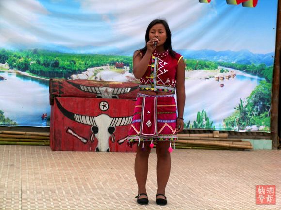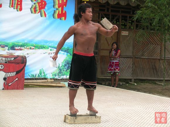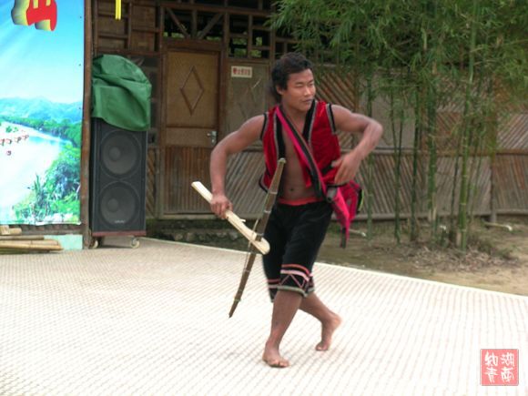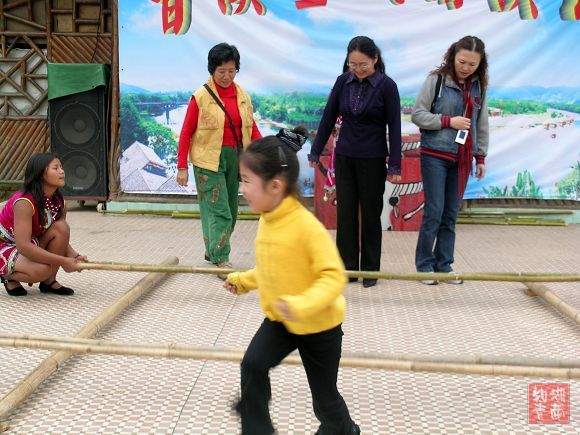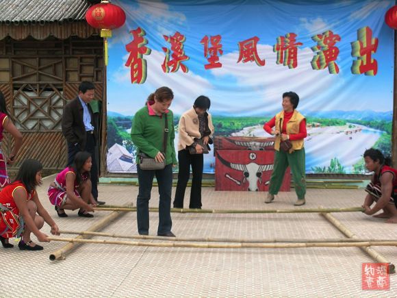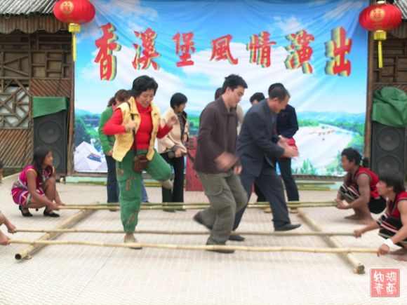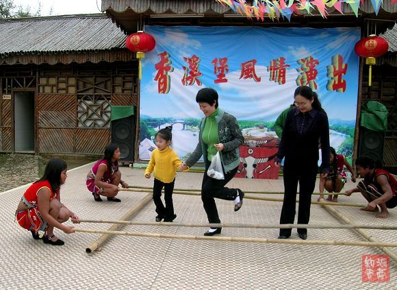 午饭后是民族风情歌舞欣赏,大家沿着翠竹掩映的小路,来到了香溪河边的一块平地上。这里的竹制舞台上有来自云南的佤族姑娘和小伙子的表演,还有竹杆舞: