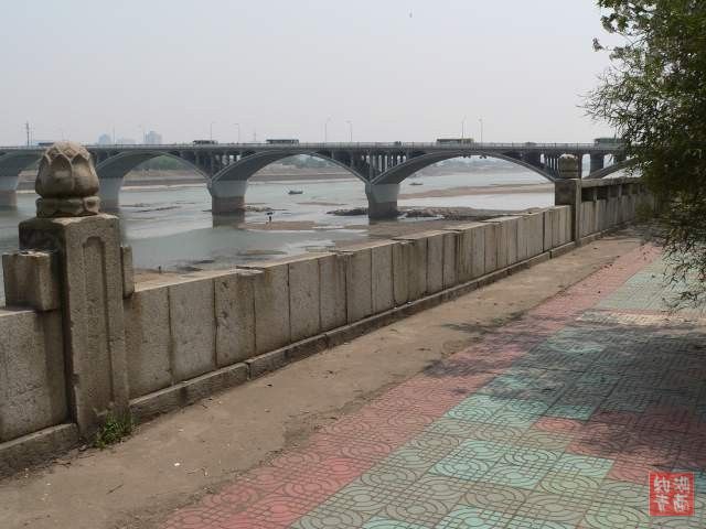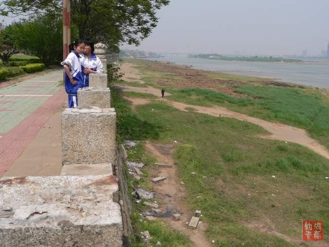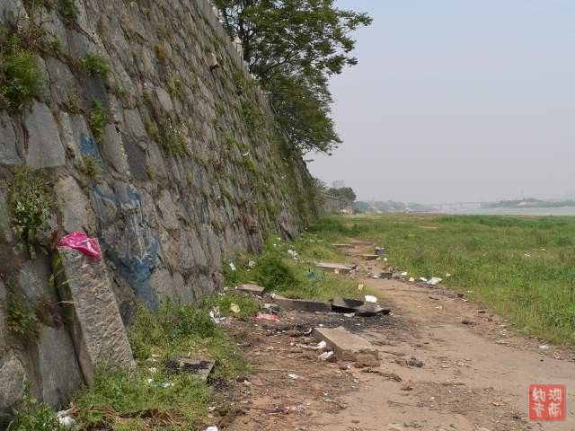 2007年年边,到潇湘大道风光带散步观景,在湘江一桥西头北侧拍到如下画面。一长段防洪堤护栏上的条石被掀下了河堤,七零八落躺在了河堤下......