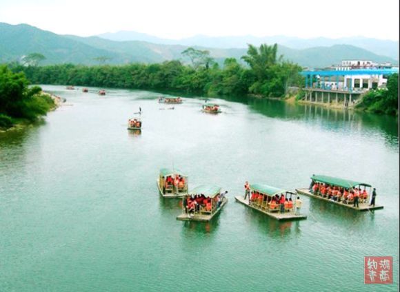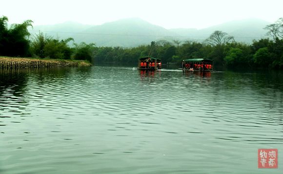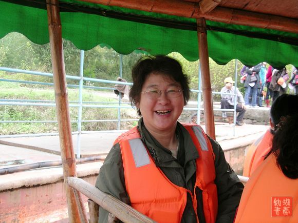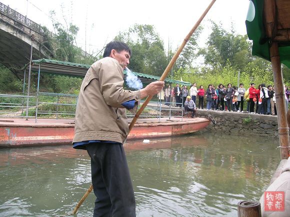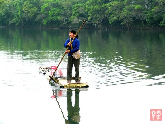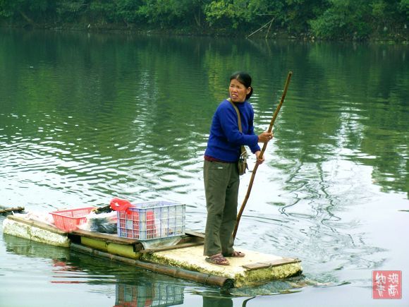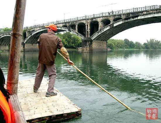 走出竹林,我们来到了“竹筏漂流”的始发点,穿上桔红色的救生衣坐上竹筏,竹筏的前、后各一船工,用竹篙撑着竹筏前进。导游说我们飘流的行程是13公里。