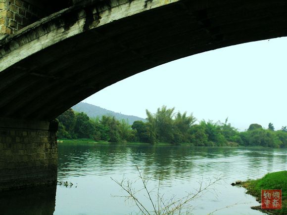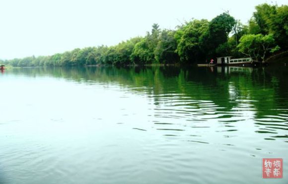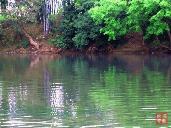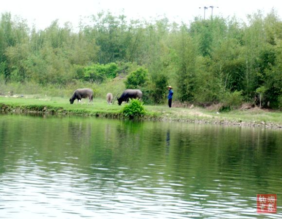 飘了一段,河面渐渐开阔起来,风光也更美了:远处青山如黛,两岸郁郁葱葱的竹林幽闲绿雅,还不时夹杂着几棵挺拔的大树,河滩上有人在放牛;而清澈的河水则映出河底的水草、卵石;对面河边还有几个姑娘、媳妇在冼衣石上冼衣,使这条河更显得生机勃勃。