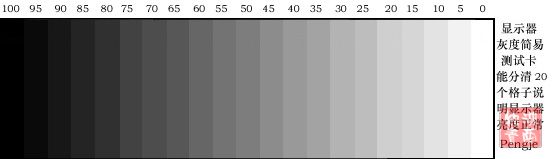 这是用PS的灰度文件做的,其灰度的浓淡完全由PS的灰度颜色来控制(0-100)。今天过细一点做了一个20阶的,大家打开这个帖子后,就可看看自己的计算机显示器显示出来的这个测试卡中,是否能分清20个格子。