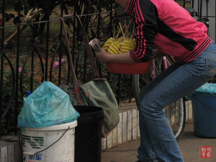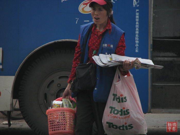 1.这位大嫂究竟卖什么?报纸?零食?左手提的塑料袋里的东西就看不清楚了。还是一旁的摩的哥告诉我,那是装捡来的矿泉水瓶子的。