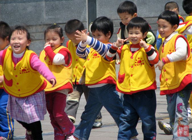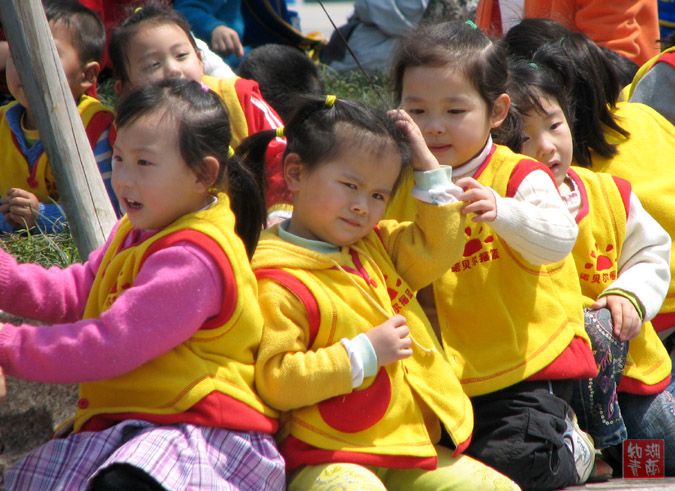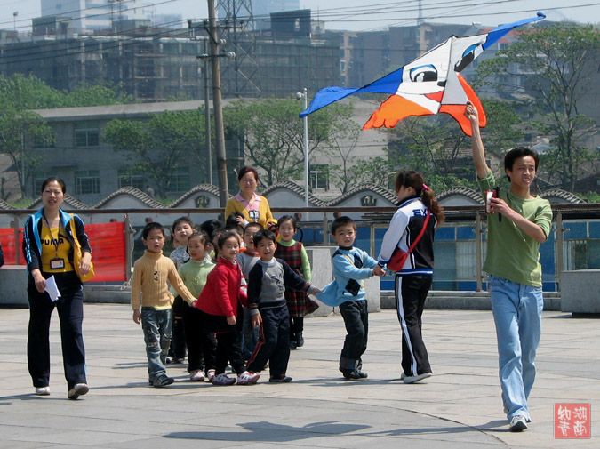 来了一大群幼儿园的小朋友。在这个班的前面,有一位男老师高举着风筝,原来他们还要举行放风筝比赛。