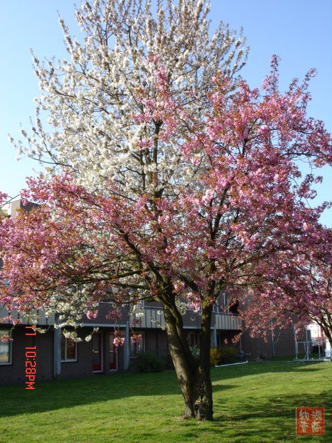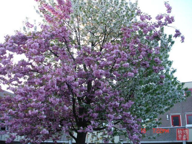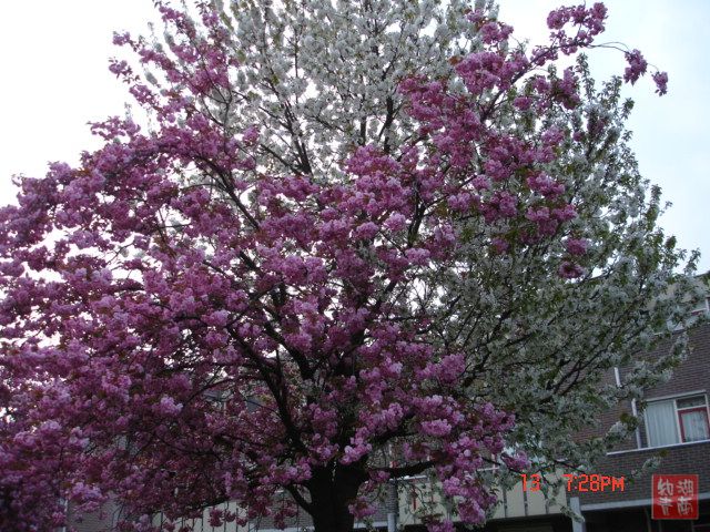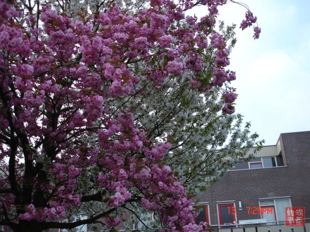 美是要发现的,不知道多少次从这颗树旁经过,平时只看到灿烂的樱花,就不知道有其它特异之处。今年听了大千和彭弟老师的话常常带着相机到处拍才发现了这么一株奇特而美丽的树。粉红的我知道是樱花,但是白的就不知道是什么花。最难得的是两种花同时开,漂亮极了。