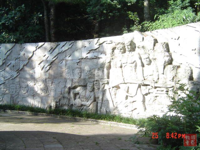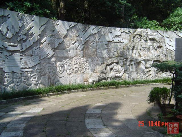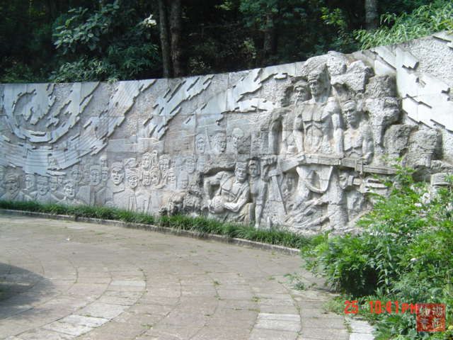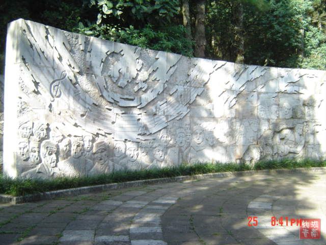 昆明西山,游人如蚁。通向龙门狭窄的山道上,摩肩接踵的游客,容不得你作片刻停留来欣赏滇池的美景。如此环境大扫我的游兴,只能随着人流下山。走至半山腰,发现山道旁有座坟茔。指示牌上写着:聂耳墓。拾级而上,走进墓区。这儿游人稀少,庄严肃穆,静谧安宁。在苍松翠柏间,伫立着聂耳的塑像。他在低头吟唱,或是在沉思……黑色花钢岩墓碑上镂刻着郭沫若手书的“人民音乐家聂耳之墓”九个大字,墓碑下的白色大理石雕刻的花环中刻着1912-1935,墓主是那年轻啊!在墓碑后,和煦的晨曦撒落在弧形墙体雕像,侧光下的石雕凸显立体感。风起云涌画面营造出“中华民族到了最危险的时候”的气氛,右边一组手持武器的军人“冒着敌人的炮火前进”。左侧一群引吭高歌的青年,“被迫发出最后吼声”。