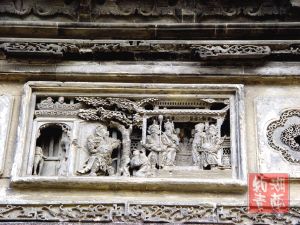 千柱屋正厅照壁上的《百马图》砖雕堪称绝品,只见这些马儿坐卧行奔、安闲长嘶、嬉戏翻滚,神态各异;连牧马人也是姿态丰富,或歇或睡,或行或忙,无一雷同。背景衬以飞禽走兽,林木山水,可见雕刻工匠的技艺高超。细心的人会发现这《百马图》根本不足百匹,才六十七匹而已。据说,当时雕刻这幅《百马图》的工匠不知何故活儿干了一半就不辞而别,斯元儒估计也请其他师傅补缺过,然而由于风格不一,就本着宁缺毋滥的精神,只让这六十七匹马儿跃然墙上。好在较真的人不是太多,权当百马欣赏吧!