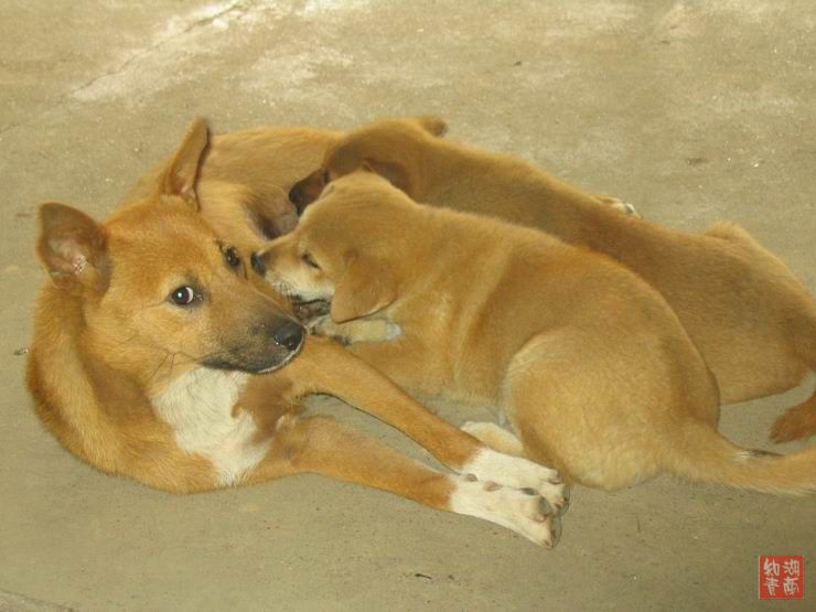 特别的,家里养了4只狗,两大两小,可能是一家人。两只小的尤其可爱,照了一张它们吃奶的照片,大家欣赏一下吧!