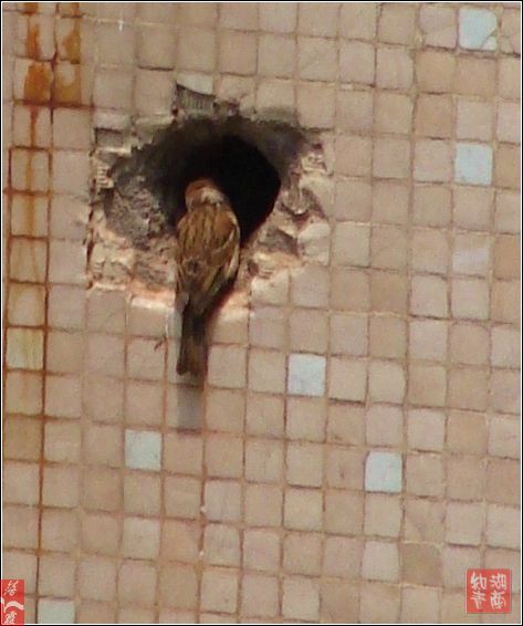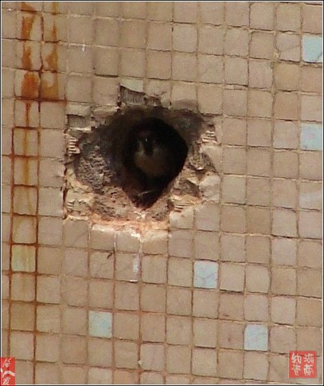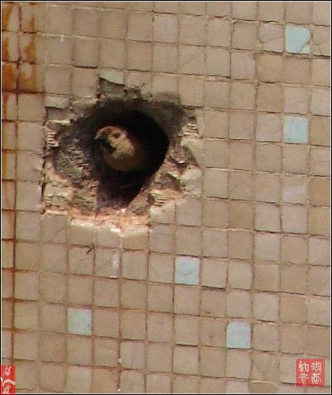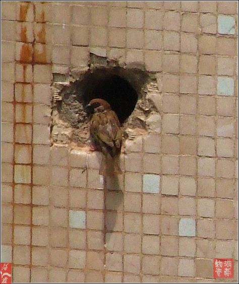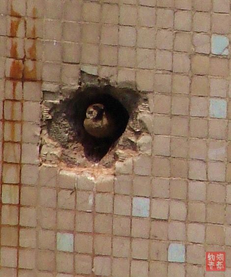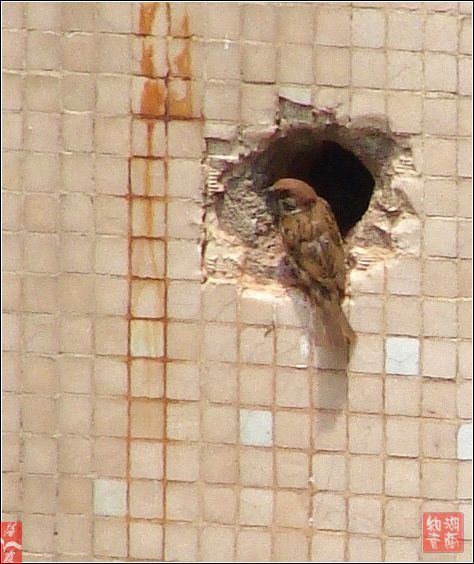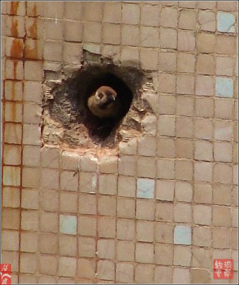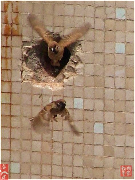 以下拍办公楼的小鸟那一组图虽然不能给人带来美感,还让我放弃了中午的休息时间镜头追踪着它们,就是为了拍到它们飞进洞中探头探脑、又从洞中飞出来的那一刹那。