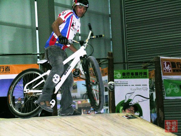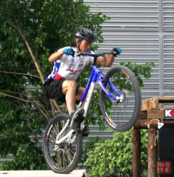 自行车极限运动表演,玩家们个个身手不凡,吸引着人们围观,更出人意料的是这极富动感的时尚运动竟然有一位二胡演奏者在悠然地拉着二胡为其配乐,这样的动、静搭配真是绝了。