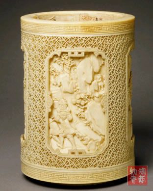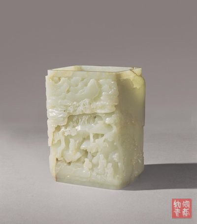 清乾隆 御制白玉镂雕竹林七贤图方笔筒.