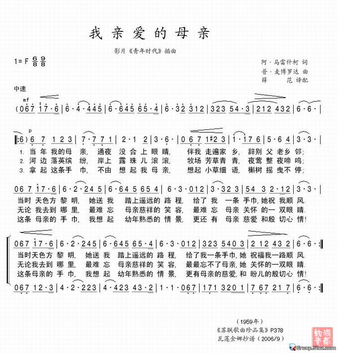 这是1959年上映的一部音乐喜剧片:娜塔莎要去报考戏剧学院,临行之前被人拖了去救场---代替一个脚踝扭伤的男孩子表演矿工舞。演出一结束,娜塔莎来不及卸装就赶往火车站,但车票已售完。这时碰见一个同样没有买到车票,同样也是去基辅报考戏剧学院的谢辽沙,两人一起扒车到了基辅。 娜塔莎有时继续以“男孩子”的身份,有时换作“男孩子的姐姐娜塔莎”的身份与谢辽沙交往,产生了许多喜剧的情节。 谢辽沙的这首歌曲在影片中出现过三次:第一次是在火车顶上;第二次是在戏剧学院的考场上,一曲《我亲爱的母亲》打动了监考的老教授们;影片最后,谢辽沙和娜塔莎避雨,躲进了一座窝棚,谢辽沙又唱起了这首深情的歌。 词作者马雷什柯(1912-1970)是乌克兰著名诗人,曾3次获苏联国家文艺奖。普拉东·麦博罗达(1918-)是乌克兰作曲家,荣膺“苏联人民艺术家”和“乌克兰人民艺术家”称号,曾获苏联国家文艺奖和乌克兰国家文艺奖。 摘自《重访俄罗斯音乐故乡》25页(mde) |