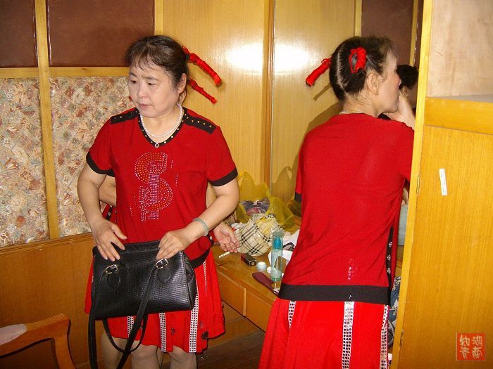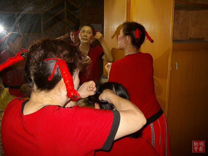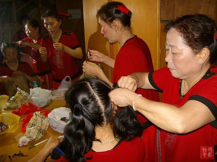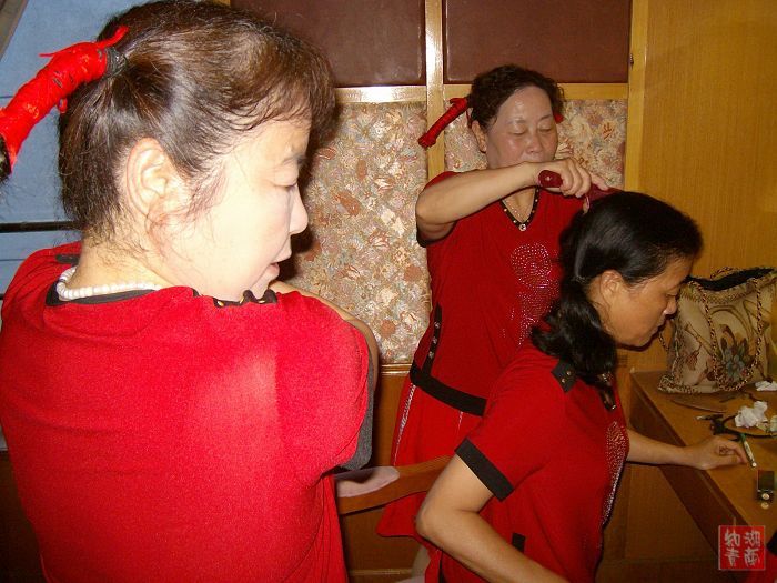 在化妆的燕子们。莫以为洁屏扎了两条辫子,是美满躲在她后面了。