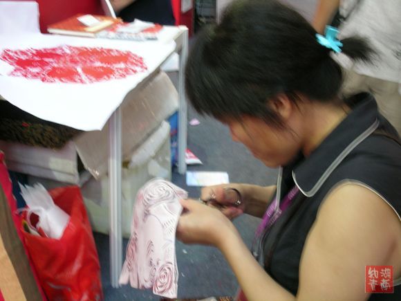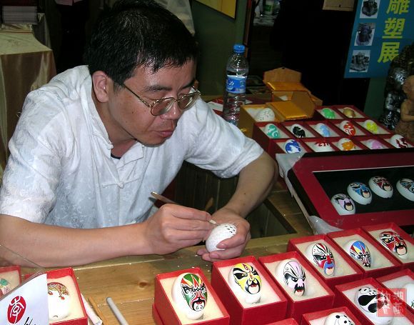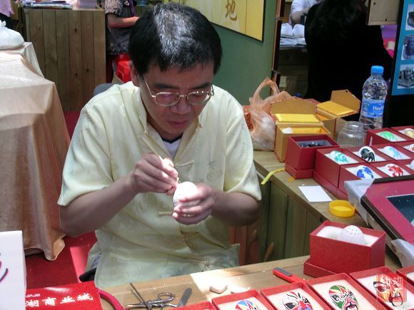 在本届文博会主会场的工艺美术馆,有一排特殊的展台,他们是来自陕西的民间艺人,有木刻年画、剪纸、皮影戏、内画、泥塑等等。