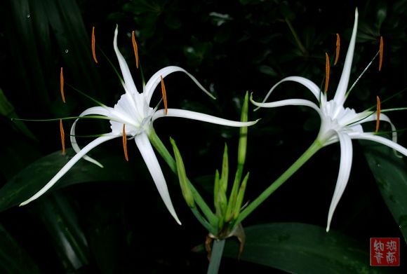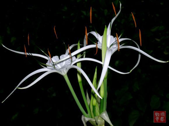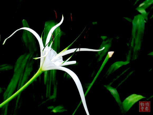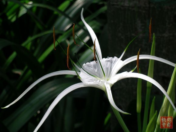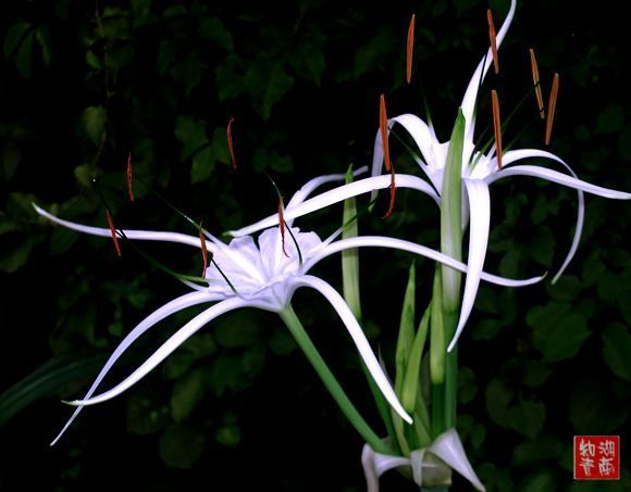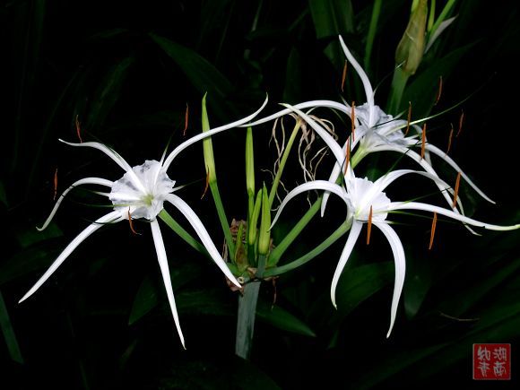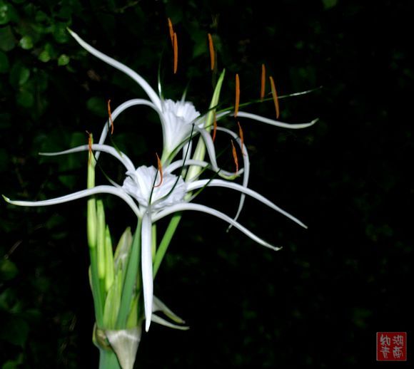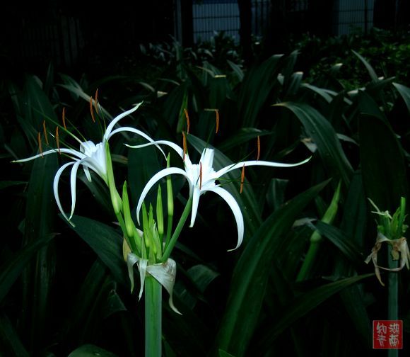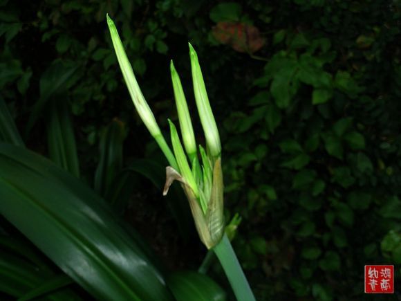我还一直以为文殊兰就是观赏叶子的花木,没想到它还会开花,更没想到那花的形状会这么奇特:一根翠绿的花茎,顶着几个毛笔样的花苞。待到花苞全开时,那花朵呈伞形,花瓣淡雅、纤细、瘦长,显得那么柔弱,那么惹人怜爱。一阵晚风徐来,那淡淡的花朵随风摇曳着,在夕阳下若隐若现,让人感受到它在倾诉一种柔柔的情怀…..