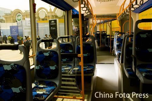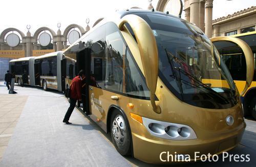 北京,由郑州宇通生产的国内第一款子弹头25米长公交车在北京展览馆亮相,此车是参加第三届北京国际商用车辆及零部件博览会。据工作人员介绍,此车采用康明斯ISLE4340发动机3节5门双铰接结构,整车采用CAN总线技术,可以自检故障。车长25米,宽2.5米,54座,可以容230人。此车有望2008年在北京长安街行驶。
