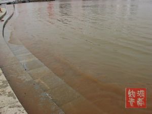 岸边一排排浊浪拍打着阶梯.