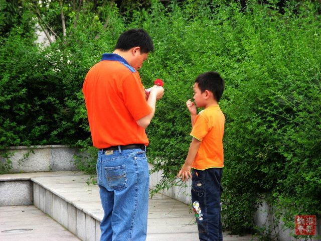 今天是父亲节,是一个永远值得纪念的日子.我拿起相机外出寻找“父亲”和“父爱”,然两鬓如霜的老父亲没见着,却摄到几位年轻的父亲,在节日里他们的爱象涓涓清泉沁入孩子的心田。