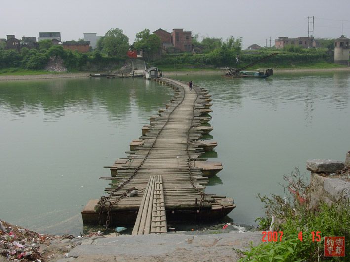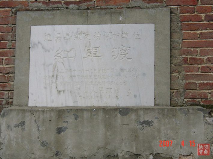 这里是红军长征过河用的浮桥,现在还使用,过一次每人五角,因这里是红军长征必经之路也是兵家必争之地,曾经在这里打过一次大仗红军损失惨重。当时毛泽东、周恩来等人在这里抡渡未成功,后由道州另一处经广西扦贵州……。
