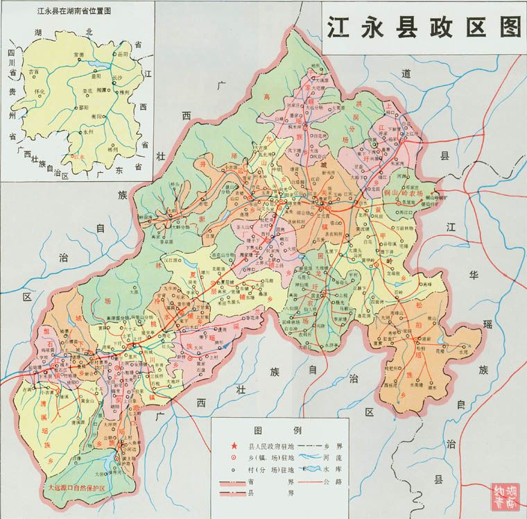 江永县位于湖南省西南端 , 处于湖南、广东和广西的交界之地 , 属永州市管辖。全县属南岭山脉的山地丘陵区,都庞岭和萌渚岭环绕四周,中部地势平坦,山间盆地相连,属喀斯特地貌。江永县总面积 1571 平方公里,人口 23.8 万。其中瑶族人口占总人口的 63 %,是典型的少数民族聚居县。 江永县旅游资源丰富 , 开发潜力巨大。县内有瑶族的发祥地 —— 千家峒、世界上唯一的性别文字 —— 江永女书、千年古村 —— 上甘棠,有历代形成的古陵、庙、楼、阁、塔、碑、桥等文化古迹 100 多处。其中允山古窑址、龙虎关古战场、黄巢墓、桃源书院等古遗址几十处,有酷似毛泽东卧像的圣人山,还有种种神奇传说。民风淳朴,瑶家习俗浓厚,盘王节、尝新节、敬鸟节、斗牛节等节日仍然盛行,节日活动丰富多彩。境内田园风光秀丽,以香柚为主的 20 万亩柚园风光为江永县增添了一道亮丽的风景。 江永地理位置优越,距桂林 180 公里 ,距阳朔仅 120 公里 . 它不仅与桂林、阳朔、贺州等地的自然资源可以形成良好的互补 , 而且还可以纳入桂林旅游圈、华南旅游圈、湘南旅游圈当中,区位优势得天独厚。