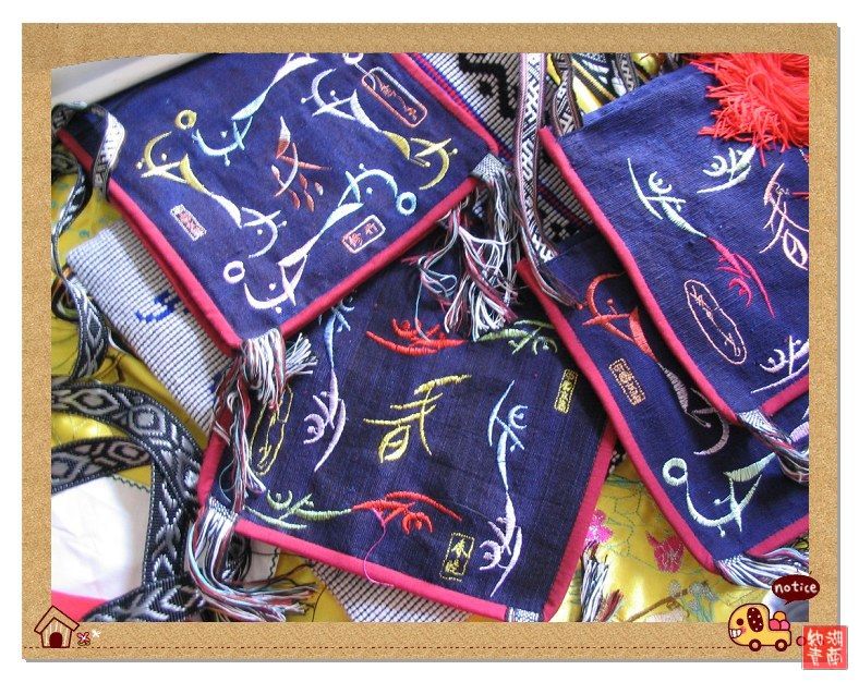 妇女们常将带有吉利含义的成语,如“万事如意”、“吉星高照”等,用女字编成图案,编织在花带和服饰中,以示祝愿佩戴者吉祥之意。