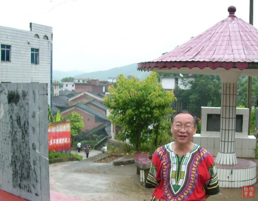 这是我们的谢老总在亭子面前照的像,这个亭子是知青自发捐的,还有知青写得碑文