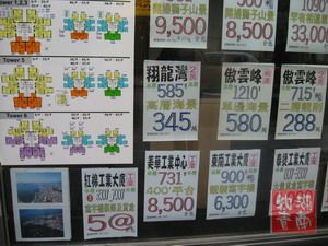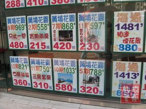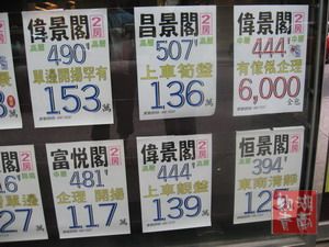 土瓜湾道的地产公司的房产牌,了解一下房价很是方便。注意,每个价钱数字后面的单位都是"万",繁体字.照片缩小后,单位看不清楚了.特此补充.